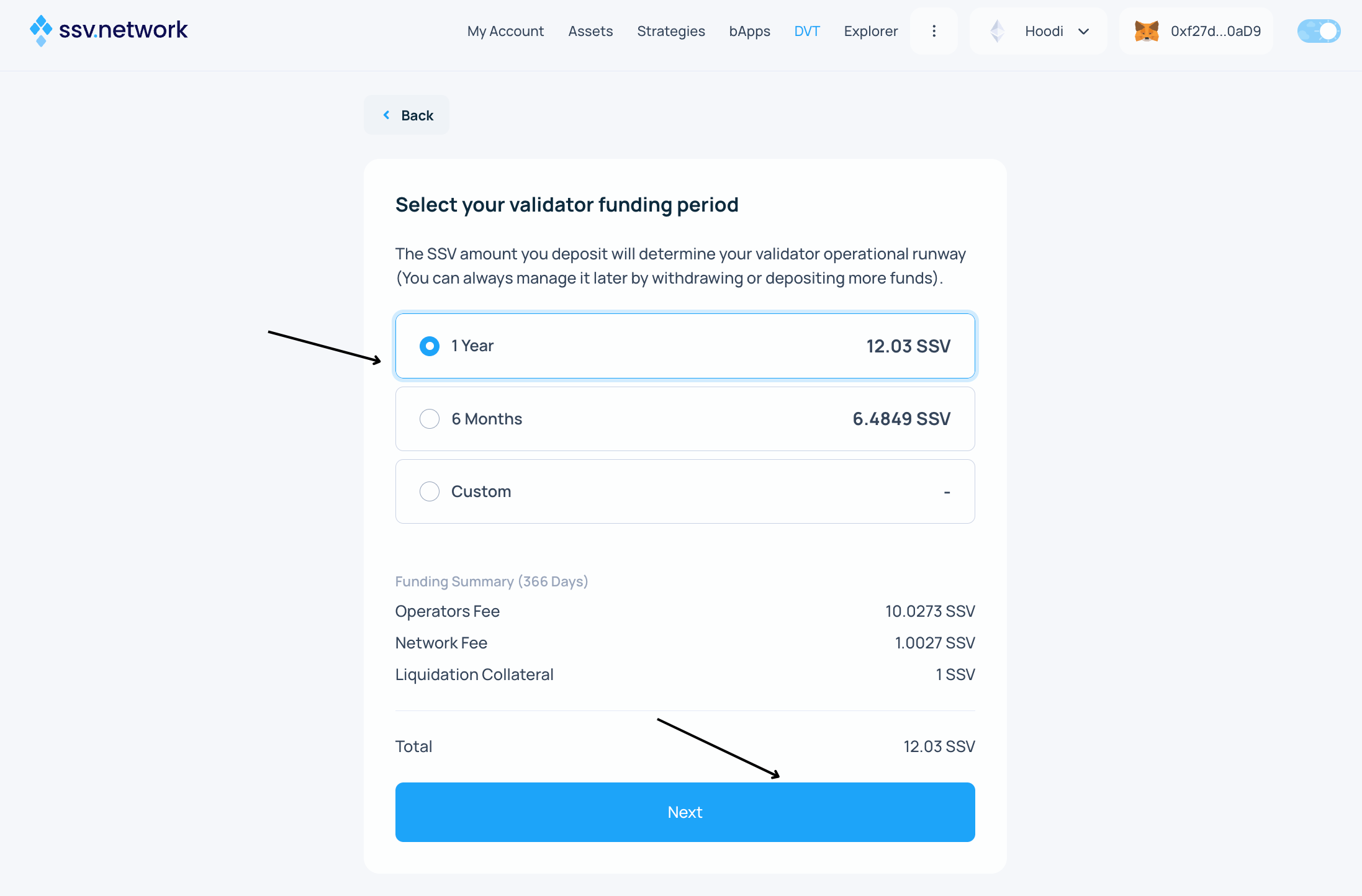 - Choose your funding period. The required SSV amount depends on your selected operators' fees and duration.